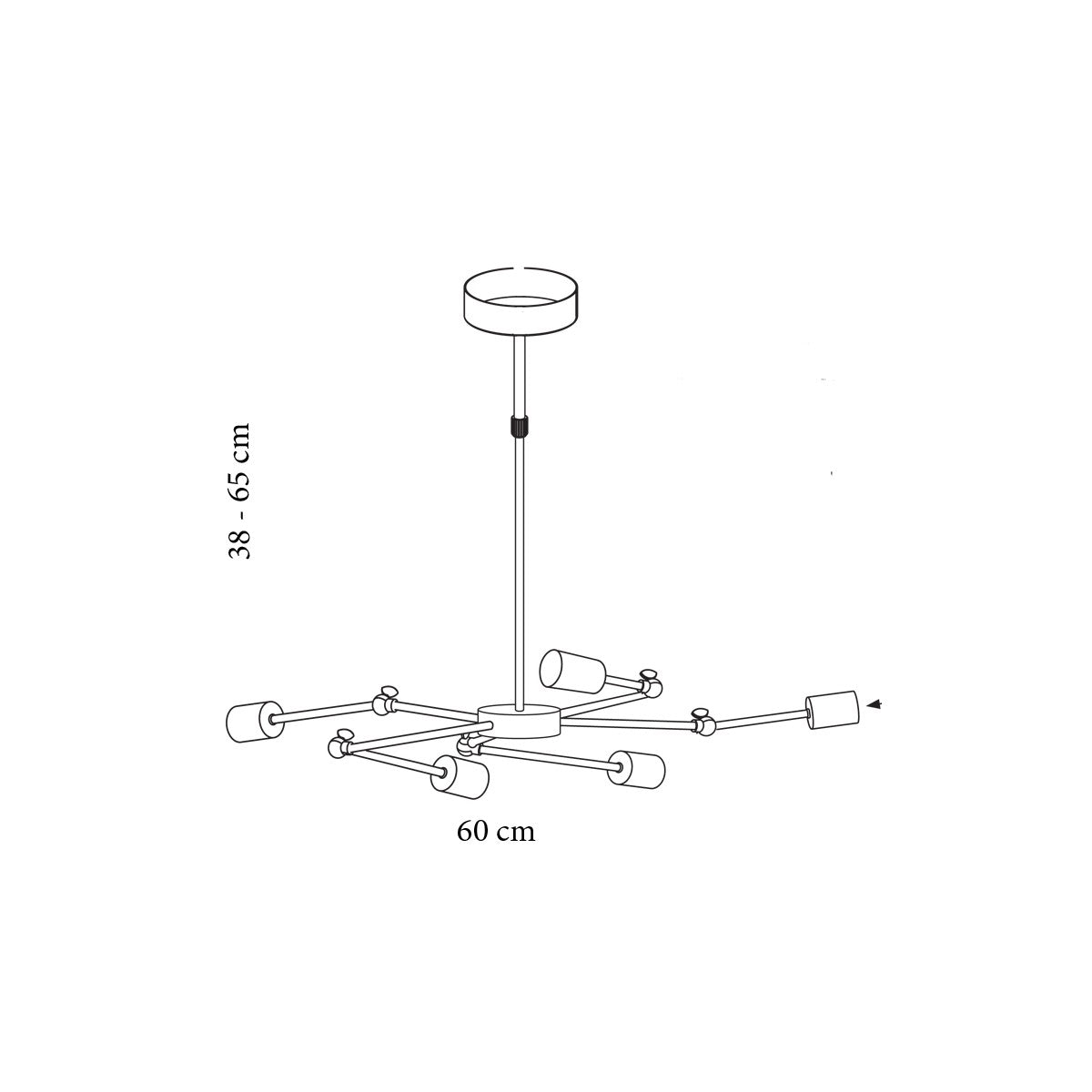 Lampada da soffitto in stile vintage con 5 luci o lampadine E27 da max 60W. Ha una struttura metallica con una finitura in oro antico che consente di regolare l'altezza della lampada.