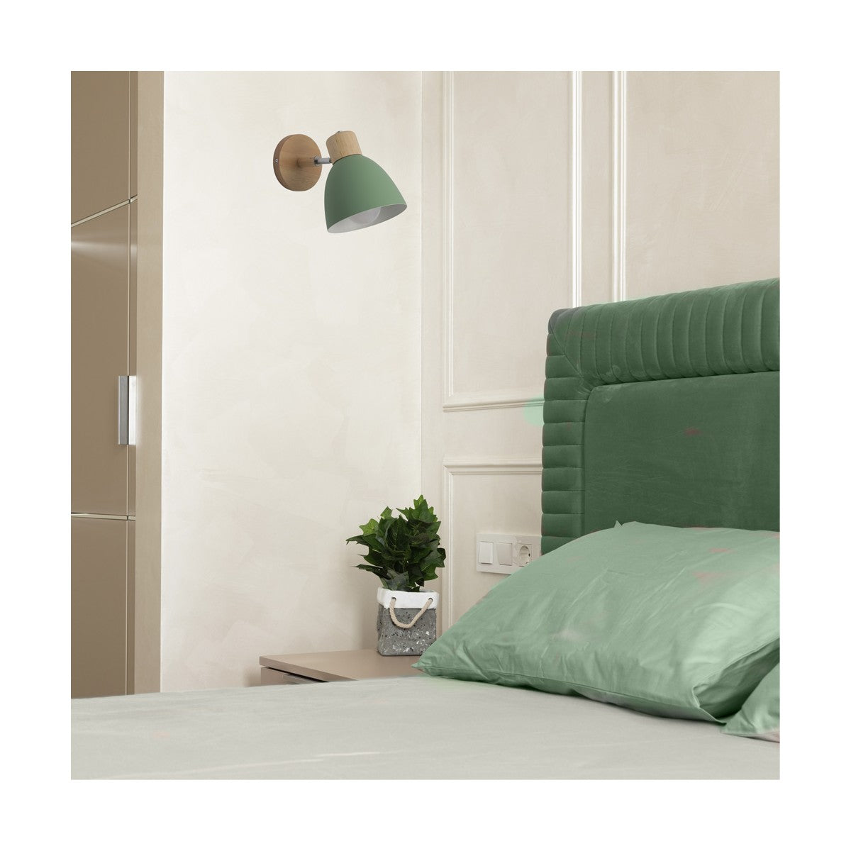 Questa applique combina elementi moderni e naturali con una struttura in metallo verniciato e dettagli in legno chiaro. Disponibile nelle varianti grigio, rosa e verde, si adatta a diversi ambienti, aggiungendo un tocco di eleganza minimalista. La testa orientabile permette di dirigere la luce dove serve, rendendola ideale per camere da letto, uffici o corridoi.
