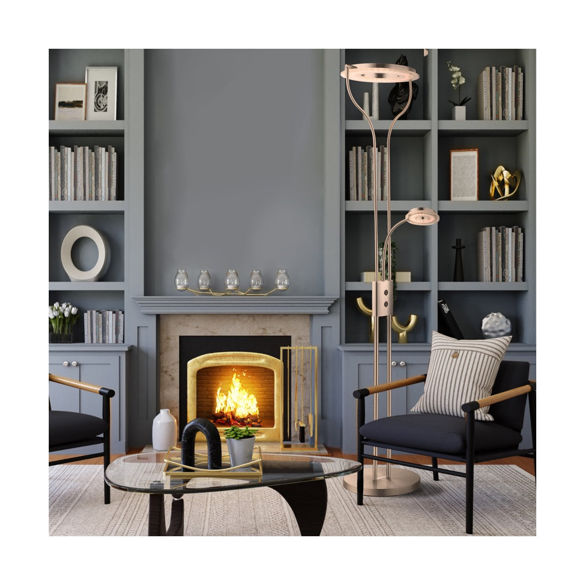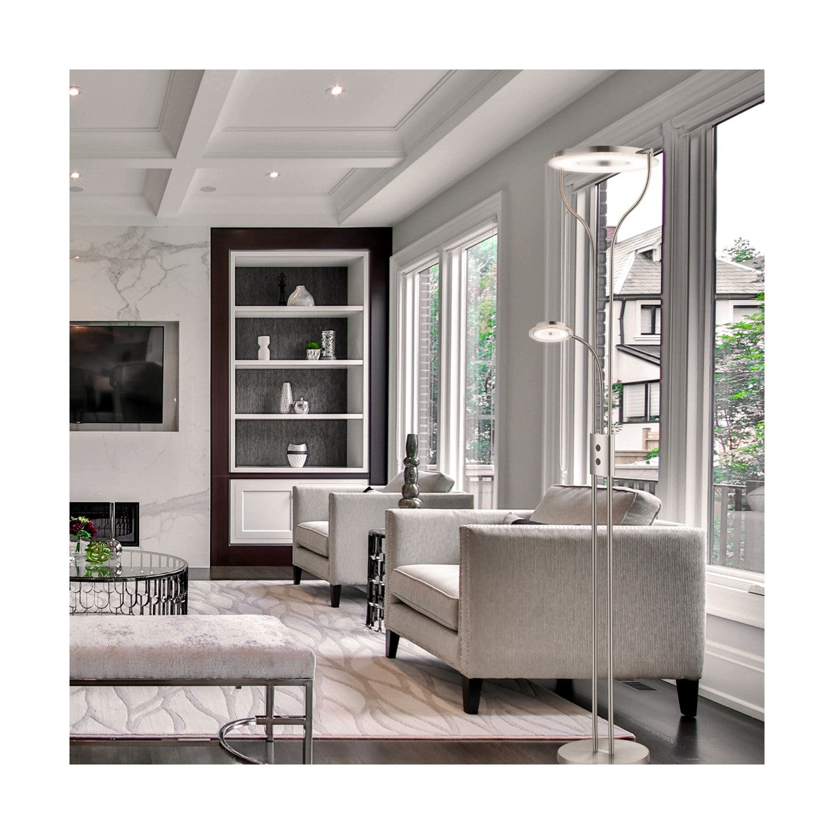 Piantana a LED in stile moderno, caratterizzata da una luce primaria orientabile molto luminosa per illuminare l'ambiente e una luce da lettura flessibile per maggiore praticità, con accensione indipendente. La struttura minimalista, in metallo con finiture eleganti, combina funzionalità ed estetica, rendendola ideale per soggiorni, studi o camere da letto.