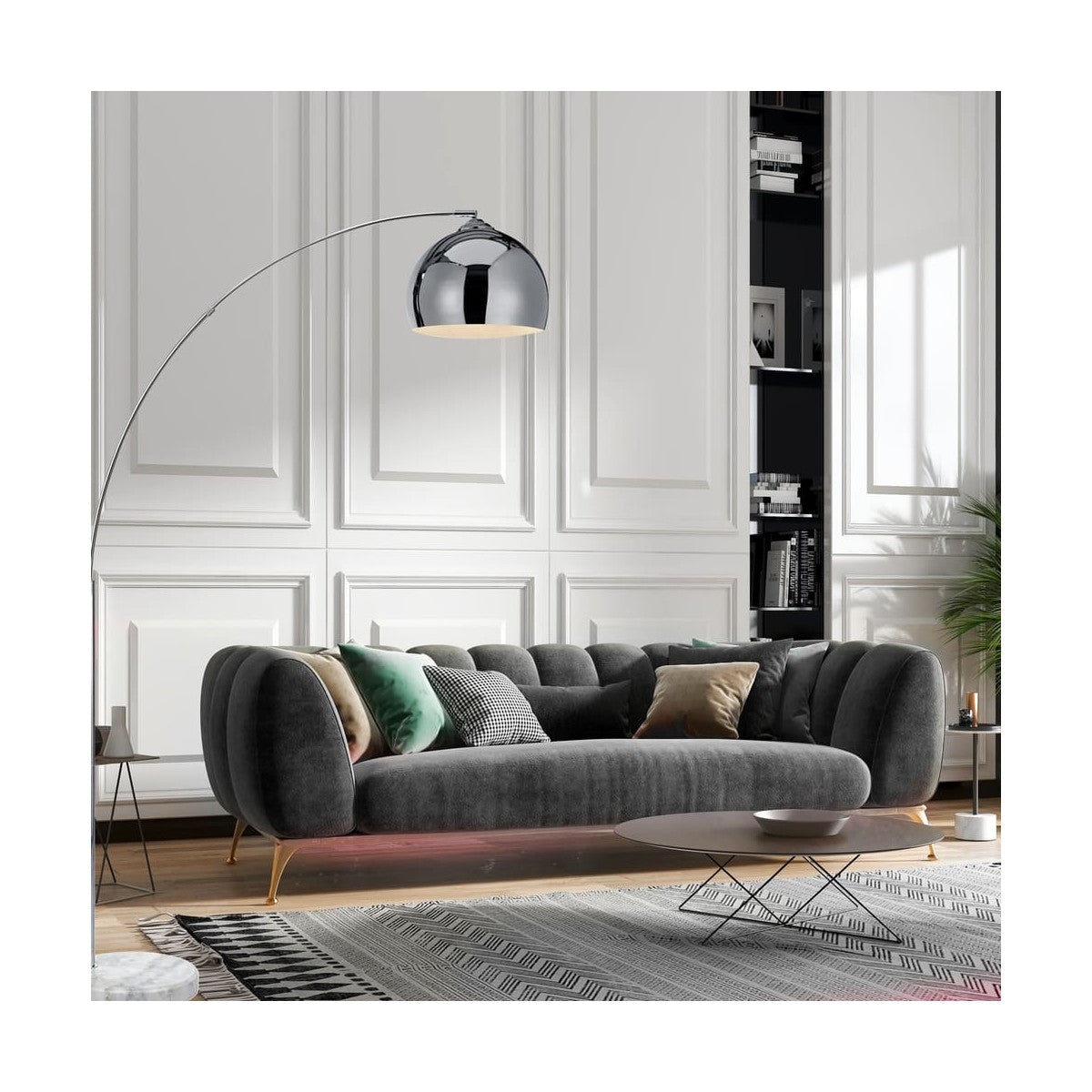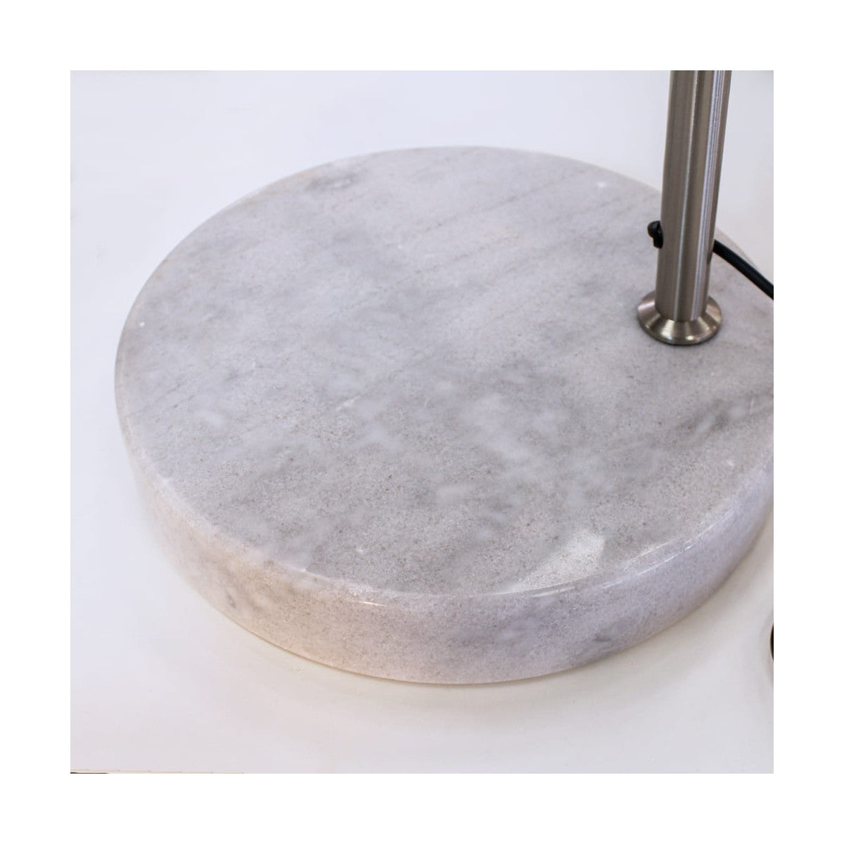 Questa piantana presenta un design moderno e sofisticato, con un lungo braccio arcuato in metallo cromato che termina in un paralume emisferico lucido. La base in marmo bianco garantisce stabilità e aggiunge un tocco di eleganza. Perfetta per creare un'illuminazione funzionale e decorativa in salotti o spazi contemporanei.