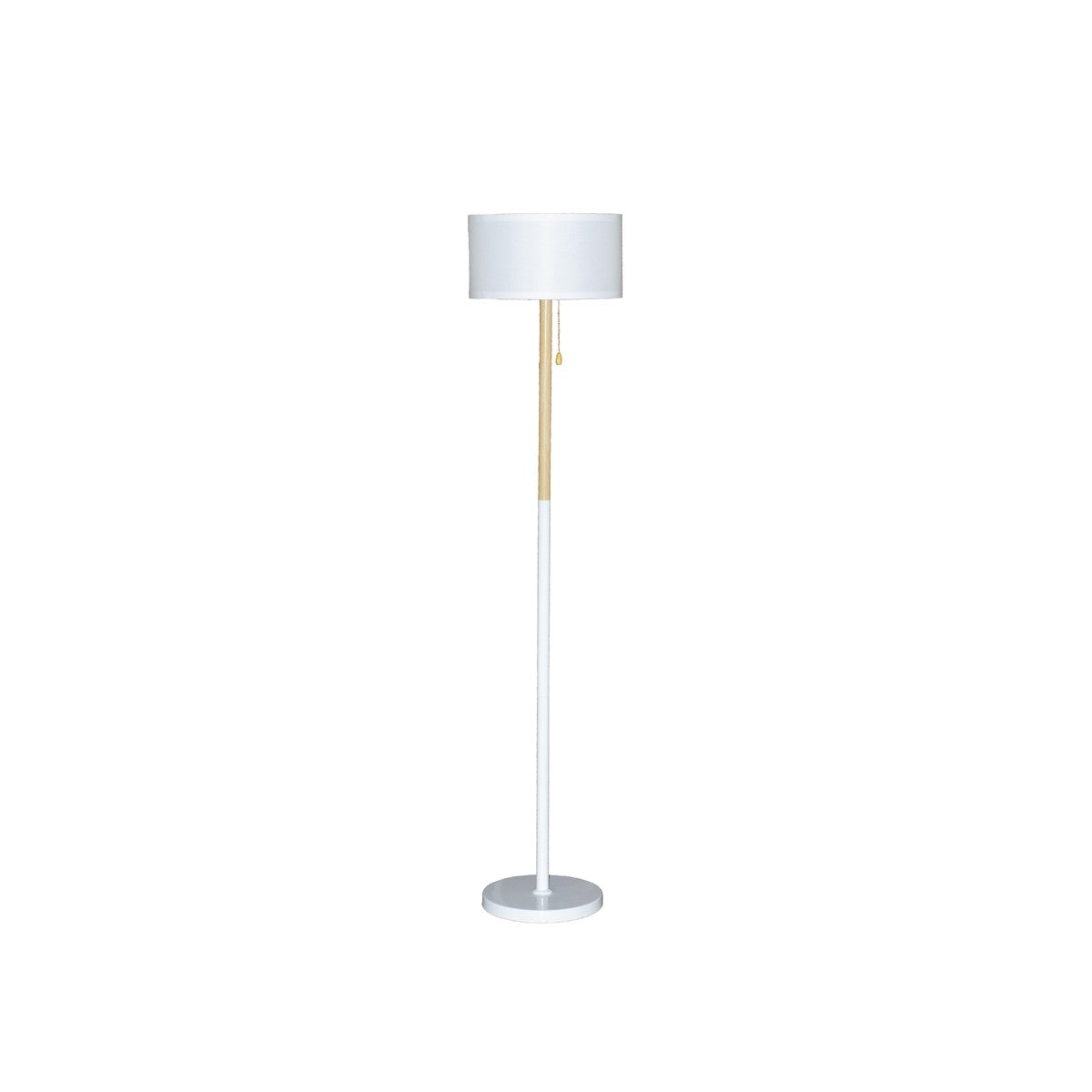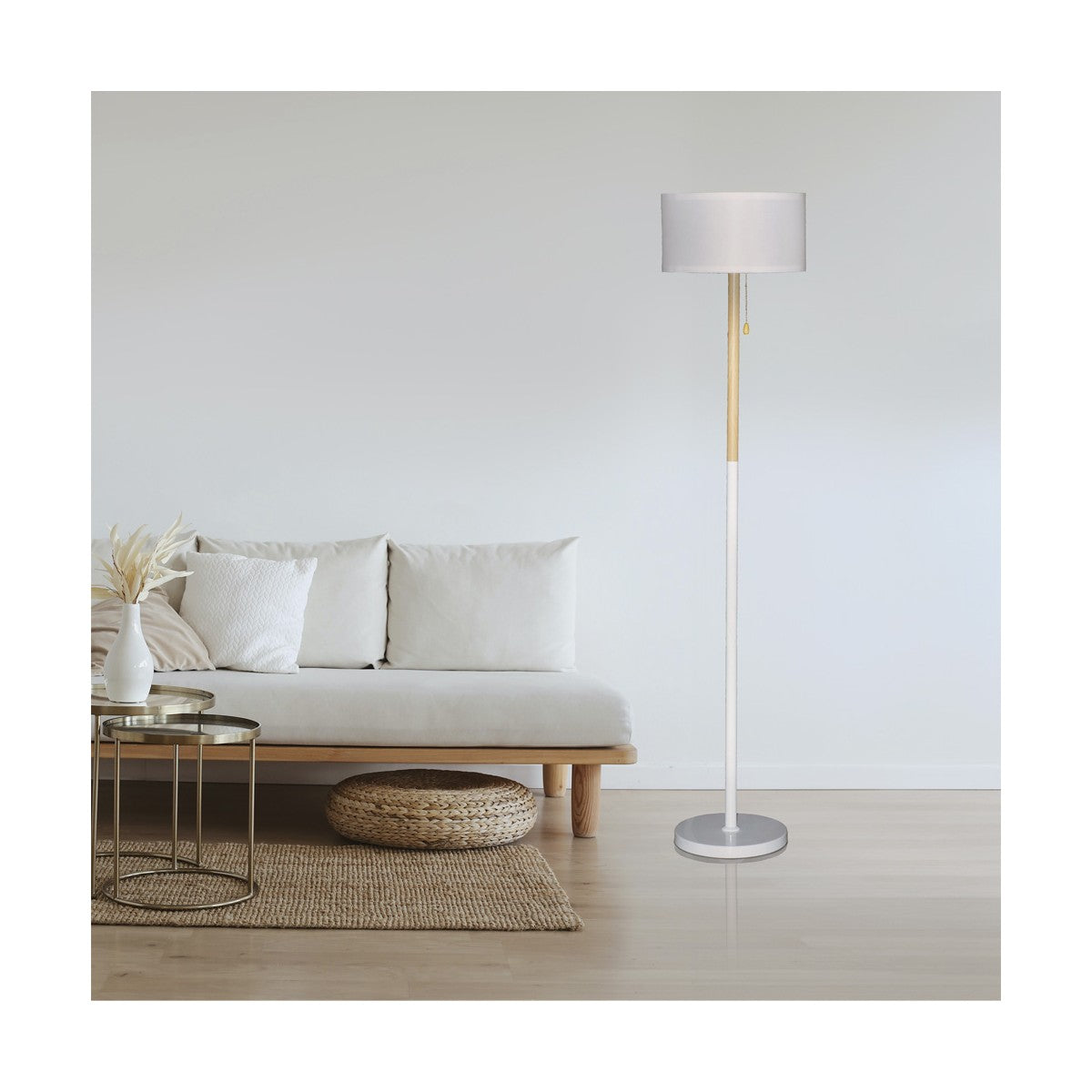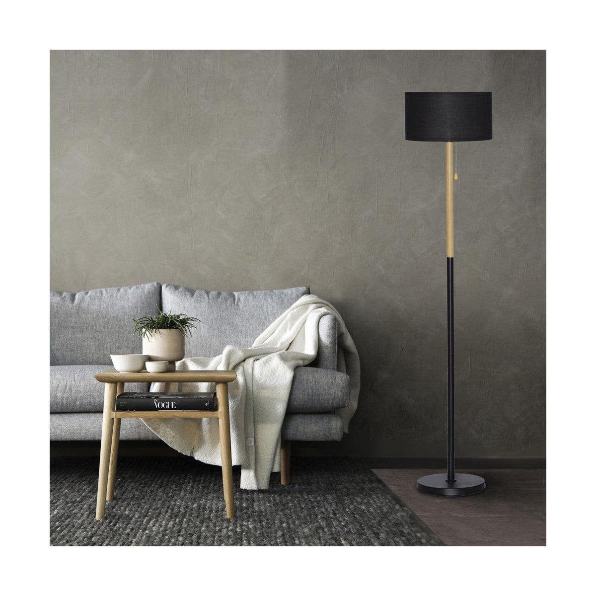 Questa piantana combina stile moderno e naturale, con una struttura elegante in metallo e un dettaglio in legno naturale che aggiunge calore e contrasto. Il paralume nero cilindrico completa il design, rendendola ideale per ambienti contemporanei e accoglienti come salotti o camere da letto