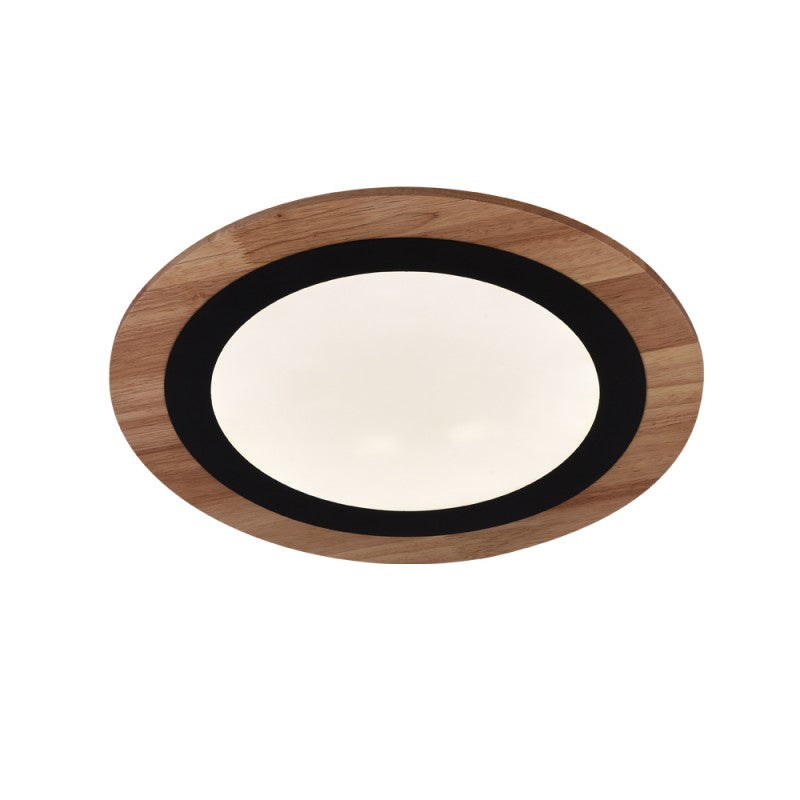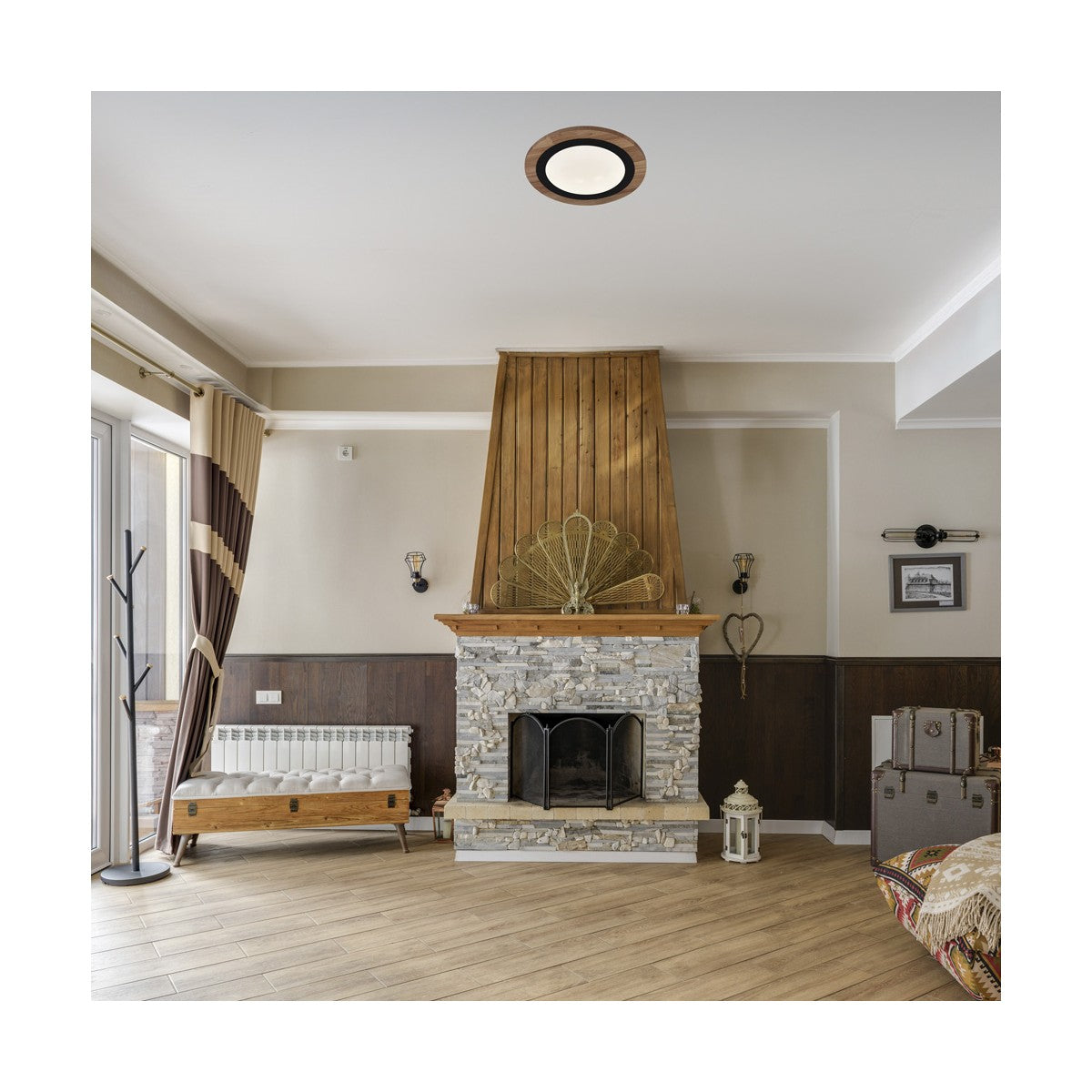 Plafoniera a LED intelligente per soggiorni e camere da letto. Lampada da soffitto circolare con tecnologia Smart e Bluetooth per controllare l'illuminazione da uno smartphone o tablet. Design circolare compatto in colore legno e un anello interno nero. Ha un'illuminazione LED integrata da 24W con 1800 lumen, regolabile nel tono e nell'intensità della luce. Include il telecomando.