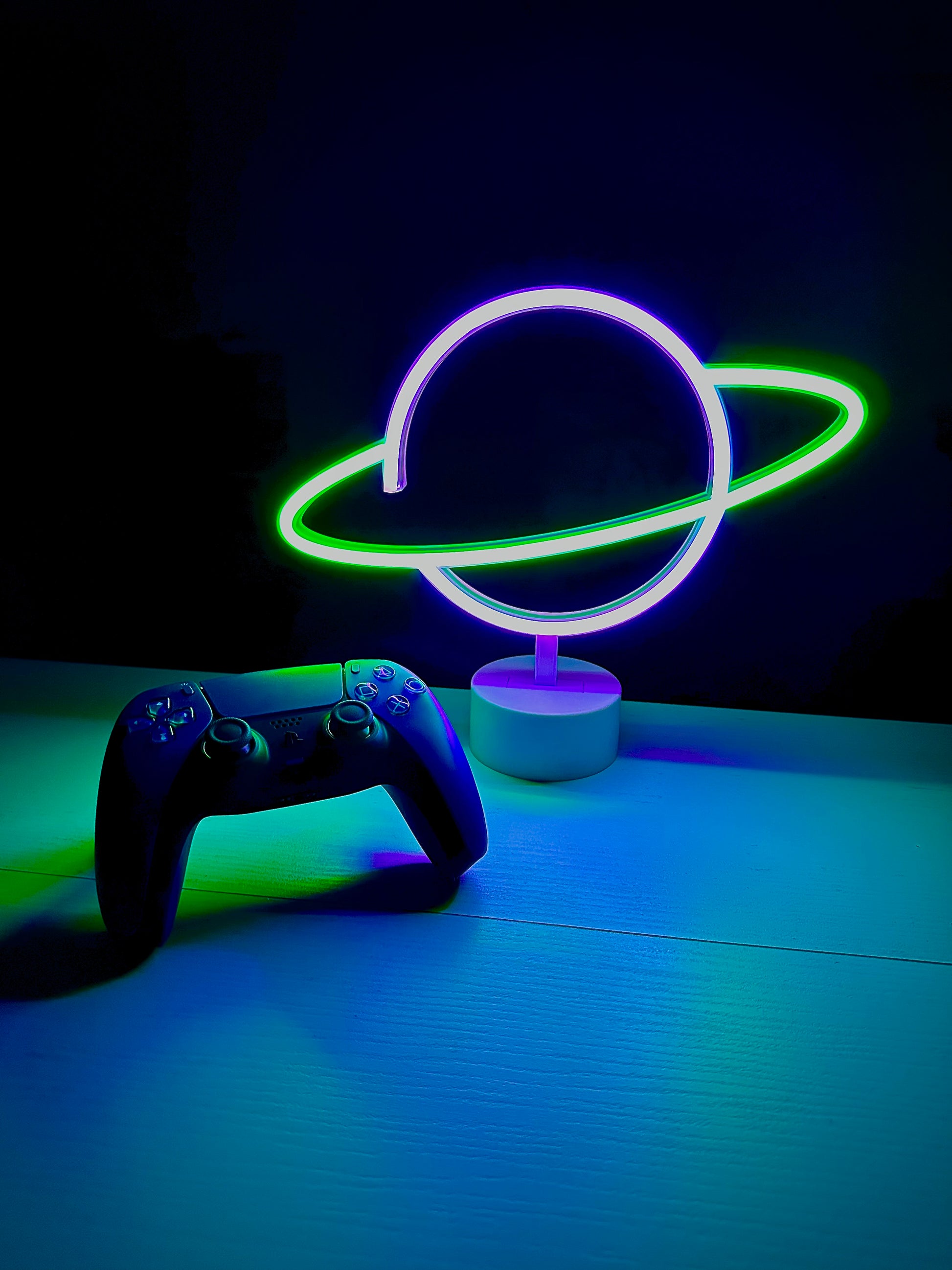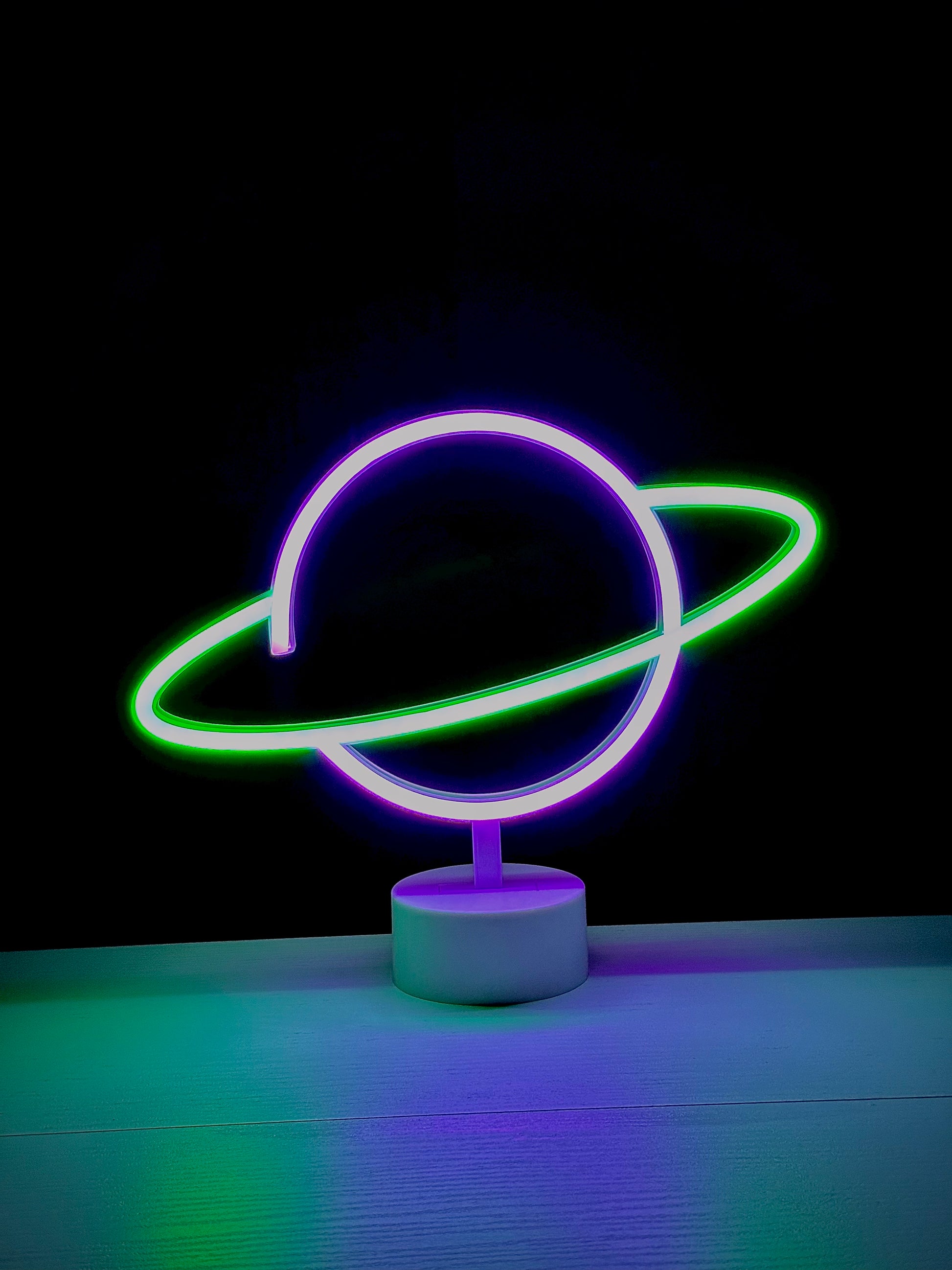 La lampada "Planet" Neonflex da tavolo è un'illuminazione decorativa che riproduce l'effetto del neon, ma utilizzando una striscia LED flessibile.
