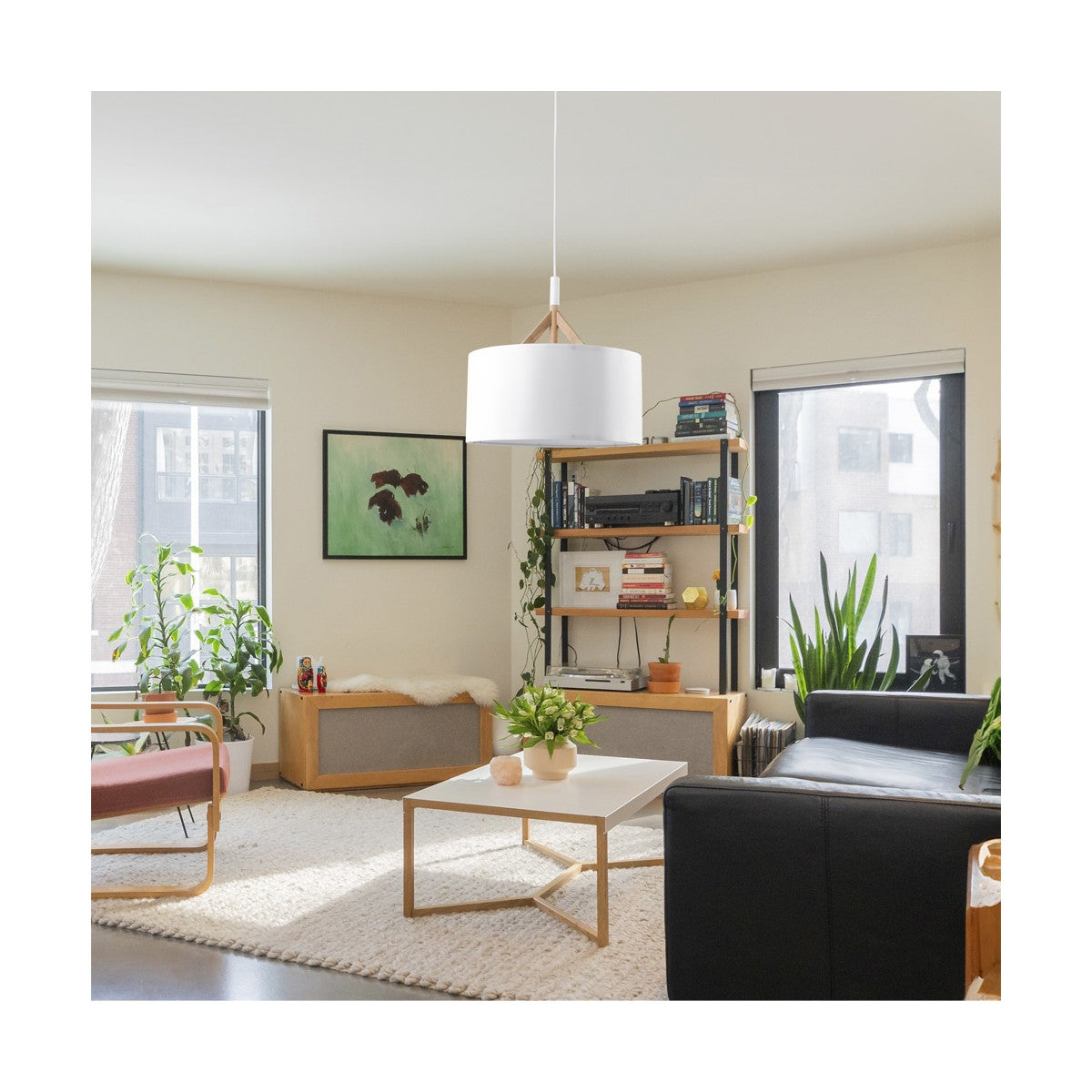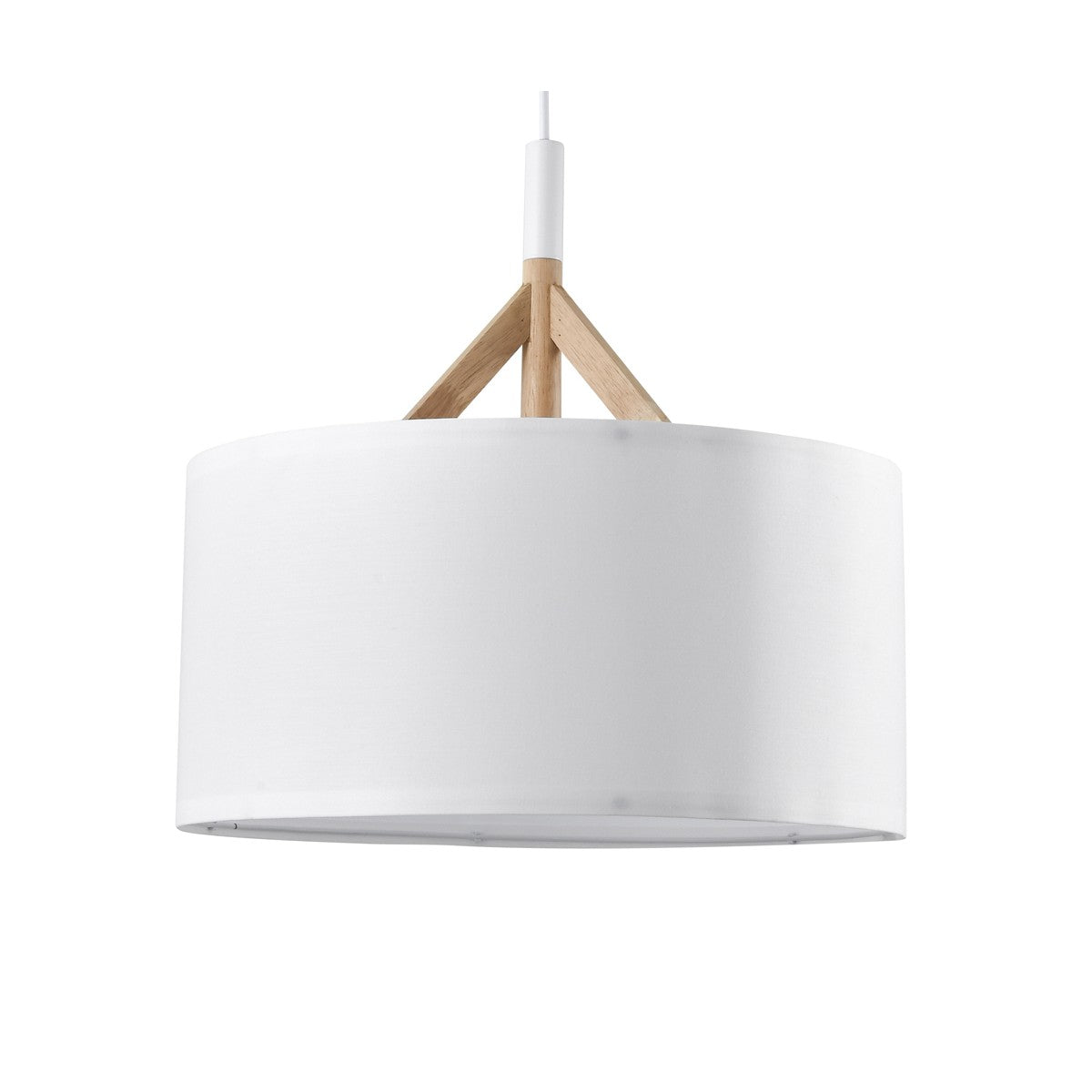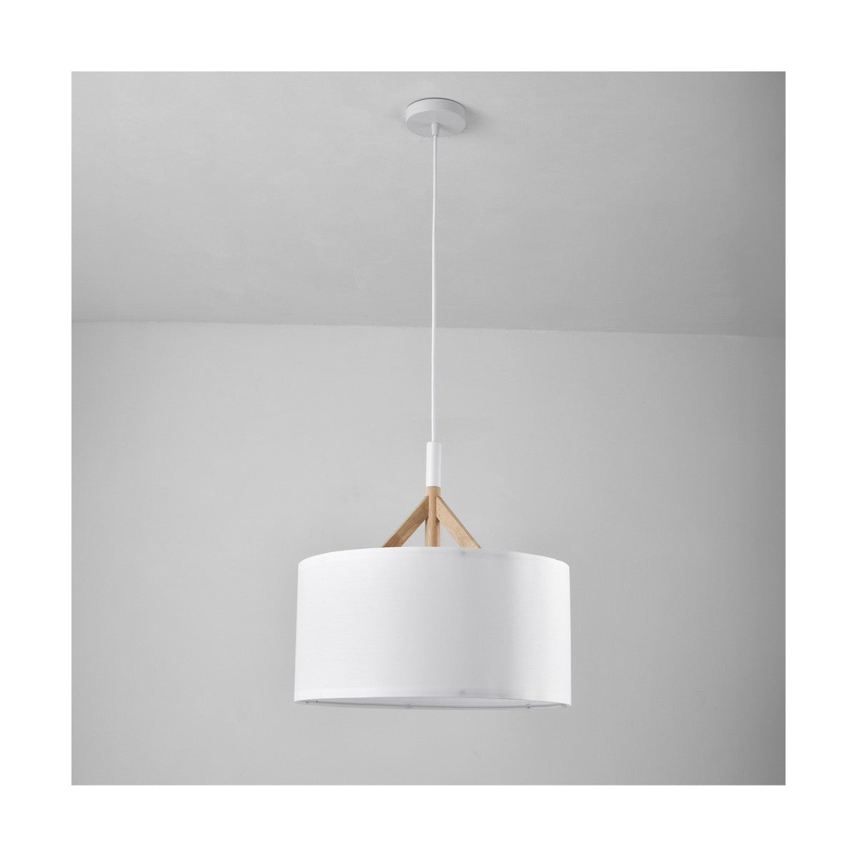 Lampada da soffitto in stile nordico con paralume in tessuto bianco e decorazione in legno sulla parte superiore. Perfetta per stanze con mobili in legno e toni scuri in sintonia. Dona un tocco scandinavo alla decorazione e all'illuminazione della tua casa. Diametro di 40cm o 30cm.