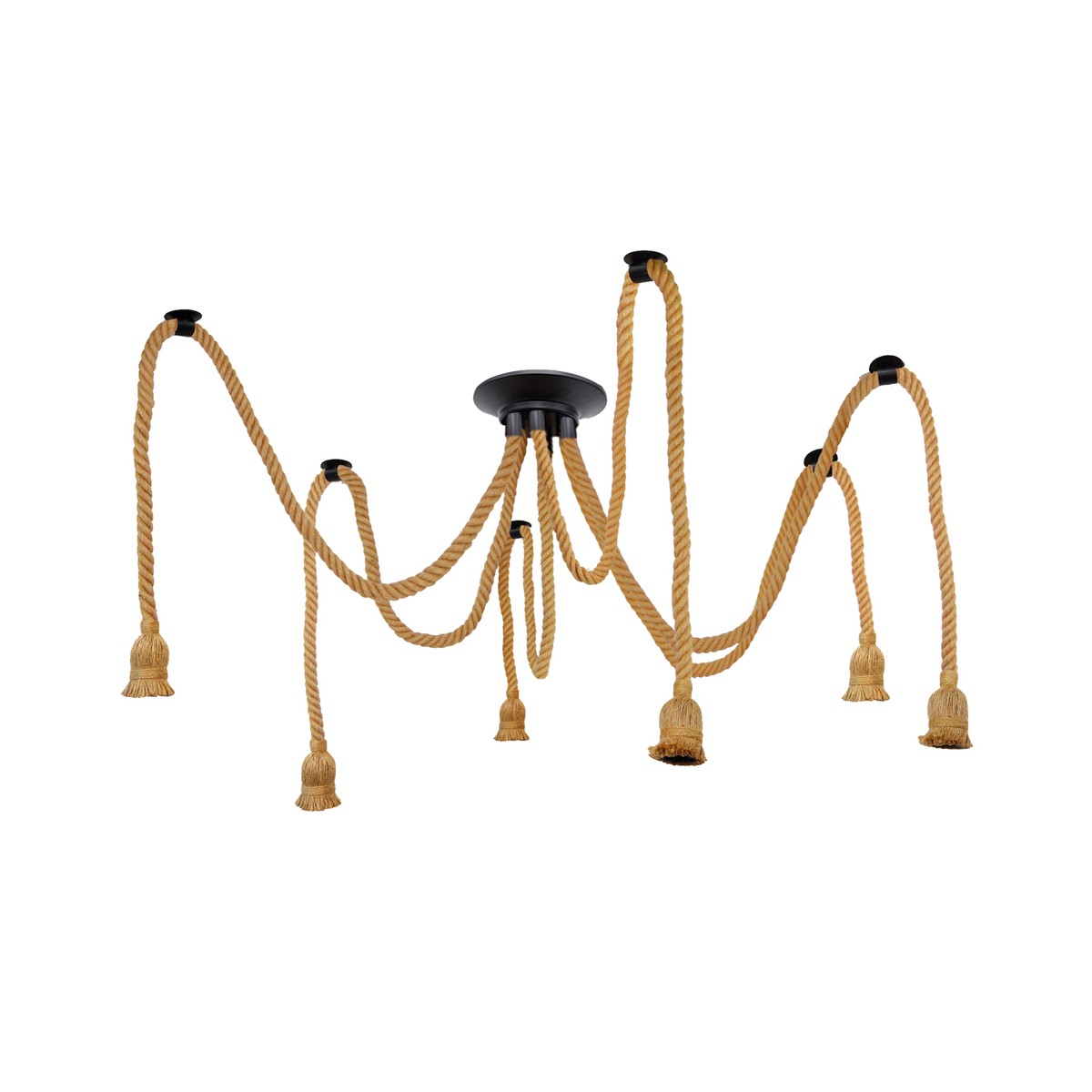 Questa è una sospensione dallo stile rustico-industriale, caratterizzata da un design unico con cavi intrecciati in corda naturale che supportano sei lampadine a vista. La struttura centrale è in metallo nero, mentre le corde flessibili permettono di personalizzare la disposizione delle lampade. Ideale per ambienti come soggiorni, cucine o spazi dallo stile vintage.